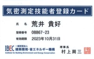 気密測定技能者登録証