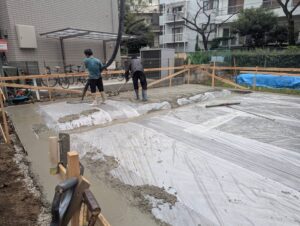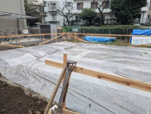 砕石地業の上に防湿フィルムを敷き並べました。