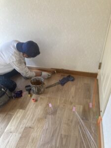 交換したばかりの巾木を塗装してもらいます。