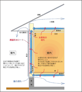 冬季に室内の高温・高湿な空気が壁内に移動して冷たい外気で冷やされれば結露します。