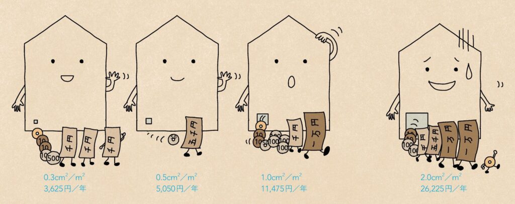 でも最近の家であれば、1.0~1.5㎠/㎡くらいの建物もあるようです。