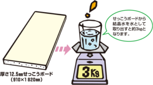 例えば厚さ12.5mm×910mm×1820mmの石膏ボードには、約3kgの結晶水が含まれているそうです。