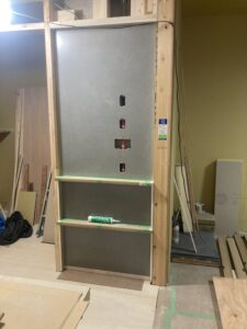 通常は配線工事の段階でコンセントボックスを取り付け、大工さんがその上に石膏ボードを張ります。