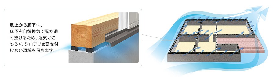 基礎パッキング工法を採用しているので、床下は全周換気の元、常時通風が確保されています。