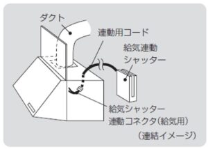 レンジフードが排気を始めると連動してモーターでシャッターが開き、給気を始める給気連動シャッター(P社の製品名)を設置するようにしています。(レンジフードに連動してシャッターが開く給気口の事です。)