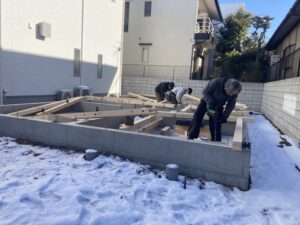 土間が凍っているせいで、多少手間取りましたが、無事土台敷きが完了しました。