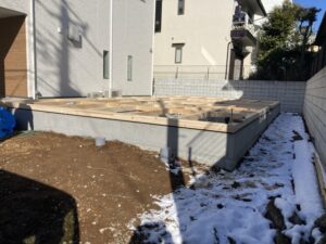 基礎天端には雪が載っていますが、基礎の中に積もってないようです。