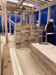 他にもFPウレタン遮断パネルや野地合板、筋違・破風下地・半柱・1階ネダノン合板が納品されるので、荷揚げ屋さんを手配しました。