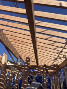 屋根の上では、屋根垂木の取付が進められています。
