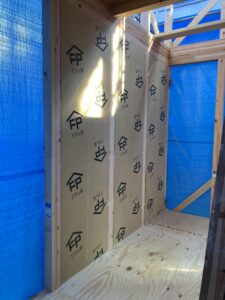 1階床パネル&ネダノン合板の施工に引き続き、壁パネルの充填を始めました。