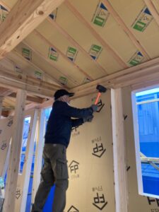 参考として、2階壁パネルを充填している様子を挙げてみました。