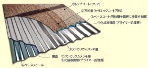 写真のように、ジンカリウム合金の上に石粒を吹き付けた屋根材です。