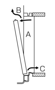 ④扉の上部を浴室内側に傾けて(A)上方へ持ち上げます。(B)