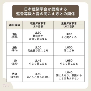 これらの遮断性能を示すために「日本建築学会」が規定した指標が「遮音等級L値」です。
