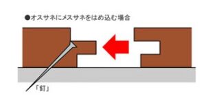 フローリングは上図のように『雄実(オスサネ)』と呼ばれる出っ張りに釘もしくはフロアタッカーを打ち込み、『雌実(メスサネ)』を嵌め込んでいきます。