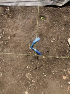 写真を良く見ると、地面に水糸が張られ、青いリボンの付いた釘が所々に刺さっているでしょ?