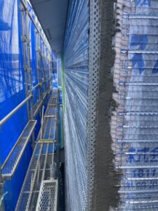 コーナー定規を取付けたら、網が隠れるようにモルタル下塗りを行います。