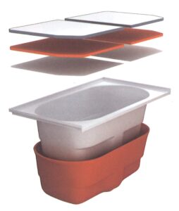 高断熱浴槽&断熱蓋を採用すると、浴槽廻りに貼りつけられた発プラ系断熱材と蓋に充填された発プラ系断熱材のW効果で浴槽内のお湯の温度低下を防いでくれます。